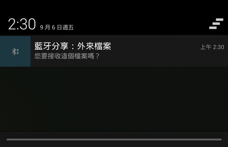3本機器接收到檔案時會發出通知,請以由畫面左上方向下滑動的方式開啟通知面板後,點選該通知。